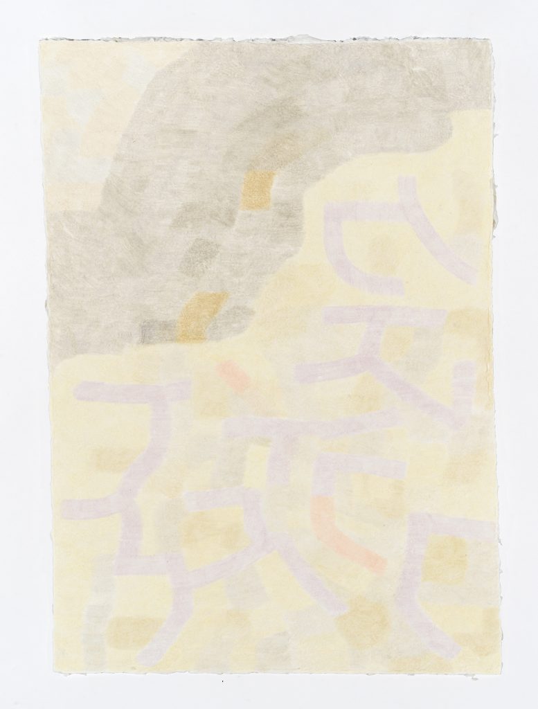Aya Nakamura’s colored pencil drawings, often on irregularly shaped handmade paper that she makes in her Chicago studio, are built slowly and through layered applications of colored pencil. Nakamura describes her aesthetic sensibility as “magpie,” an attraction to disparate things that compel attention through their distinctiveness or evocative power, and toriawase, a Japanese term referring to the bringing together of varied elements to create a resonant whole. She thinks of each element in the drawing as a consciousness that engages directly with its neighbors and aggregates into a larger entity, like an anthill. The result is a series of encounters and references to sense memories of her relationship to nature and to sound, a permeability of space and form, embedded sensitivities, and touch. Variegated lines move across, alongside and into fields of color, and these assemble into amorphous compositions that appear to simultaneously build and dissolve. Some have visual links to existing symbols and objects, which provide a starting point and focus.