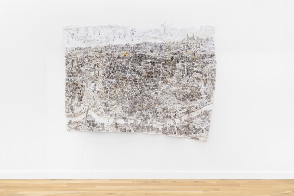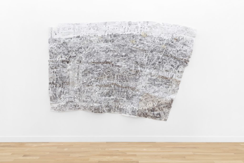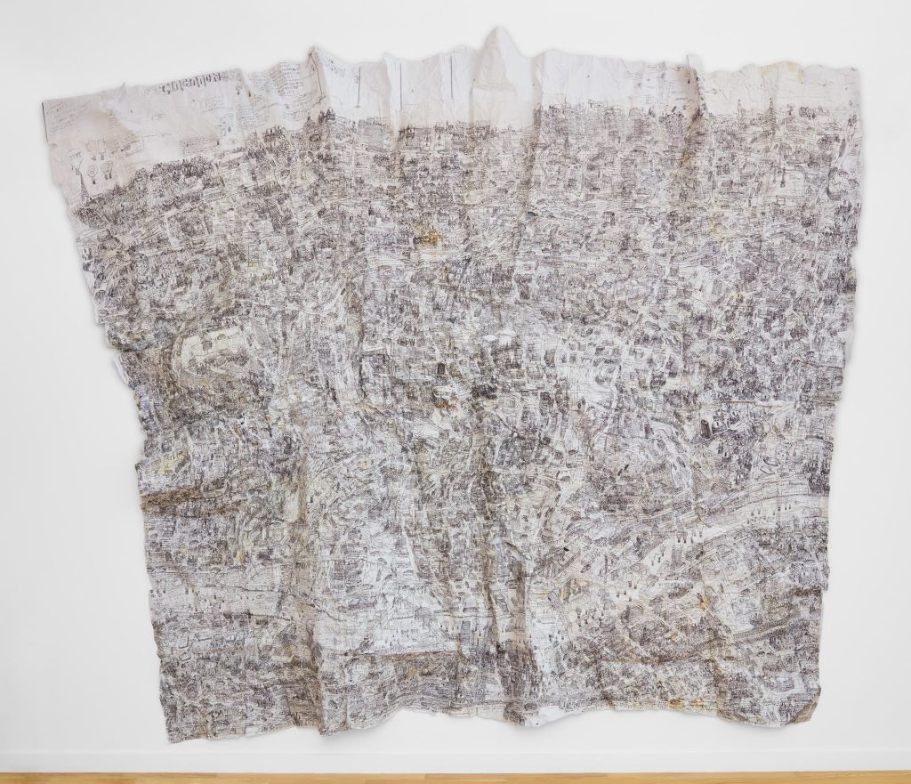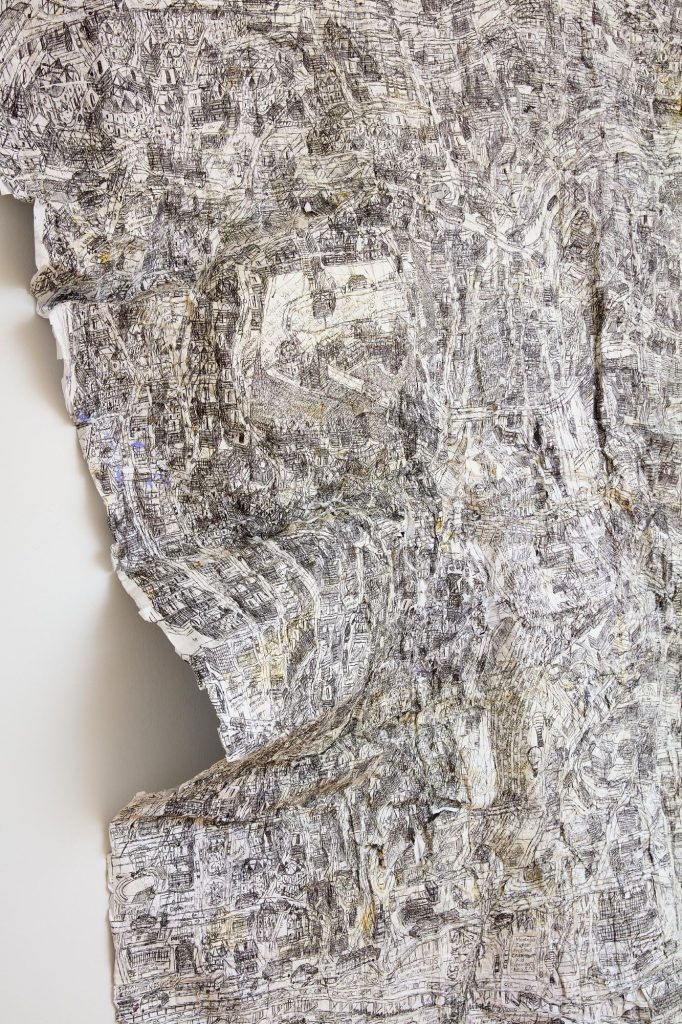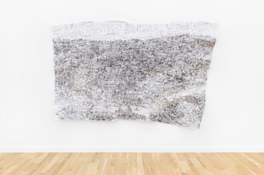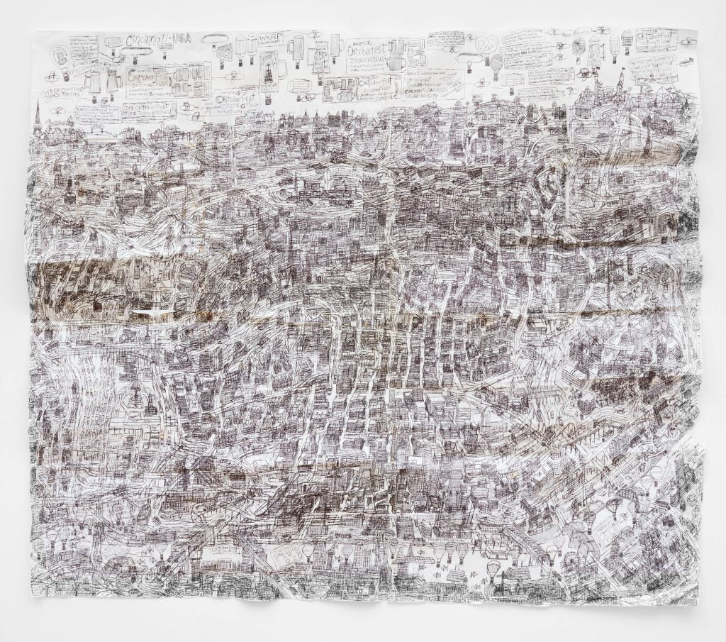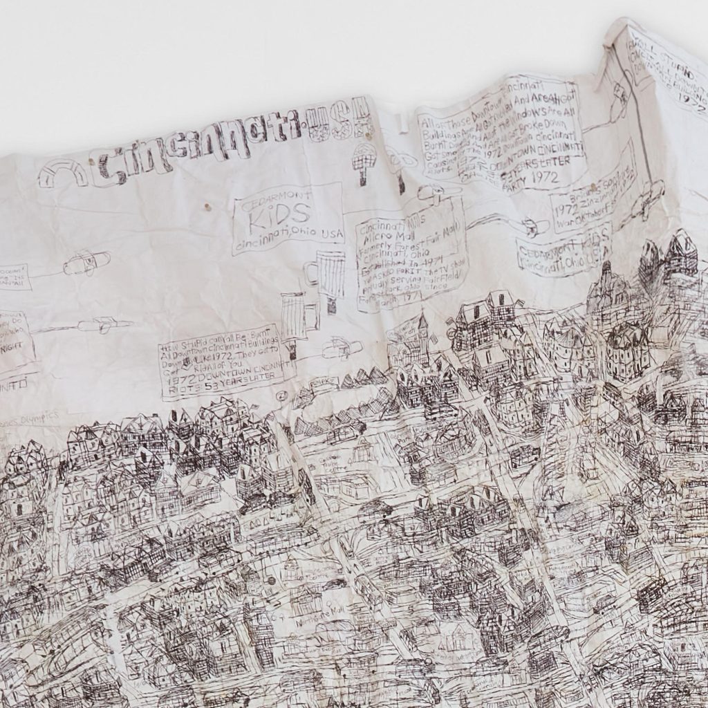 Courttney Cooper draws large elaborate and exuberant maps from his physical and psychological experiences in Cincinnati, Ohio. Gluing together pieces of found paper from his job at a grocery store, Cooper’s obsessive drawings, rendered with ballpoint pens, map out neighborhoods in his hometown in remarkable detail. Buildings, streets, and conversations are all recorded from memory. His maps depict more than just streets and monuments, often addressing the season in which it was made, current events and projects going on locally, like the WEBN fireworks or the Taste of Cincinnati, even going back into the drawings to update them when new buildings are constructed or torn down. Cooper is always celebrating Oktoberfest in his life and in his work, you will find references to beer, balloons, pretzels, and German culture. Throughout the sprawling maps are written thoughts and phrases hidden beneath the landscape and revealed within the open white space of the paper, as noted in Matt Morris’ review on artforum.com: “But the party above belies the social tensions below: Gradually, one notices scrawled writing layered underneath Cooper’s landscapes, the text erupting in the blank passages of the streets.” Cooper’s work illustrates a sublime moment in time, attempting to understand something as complex as a city.