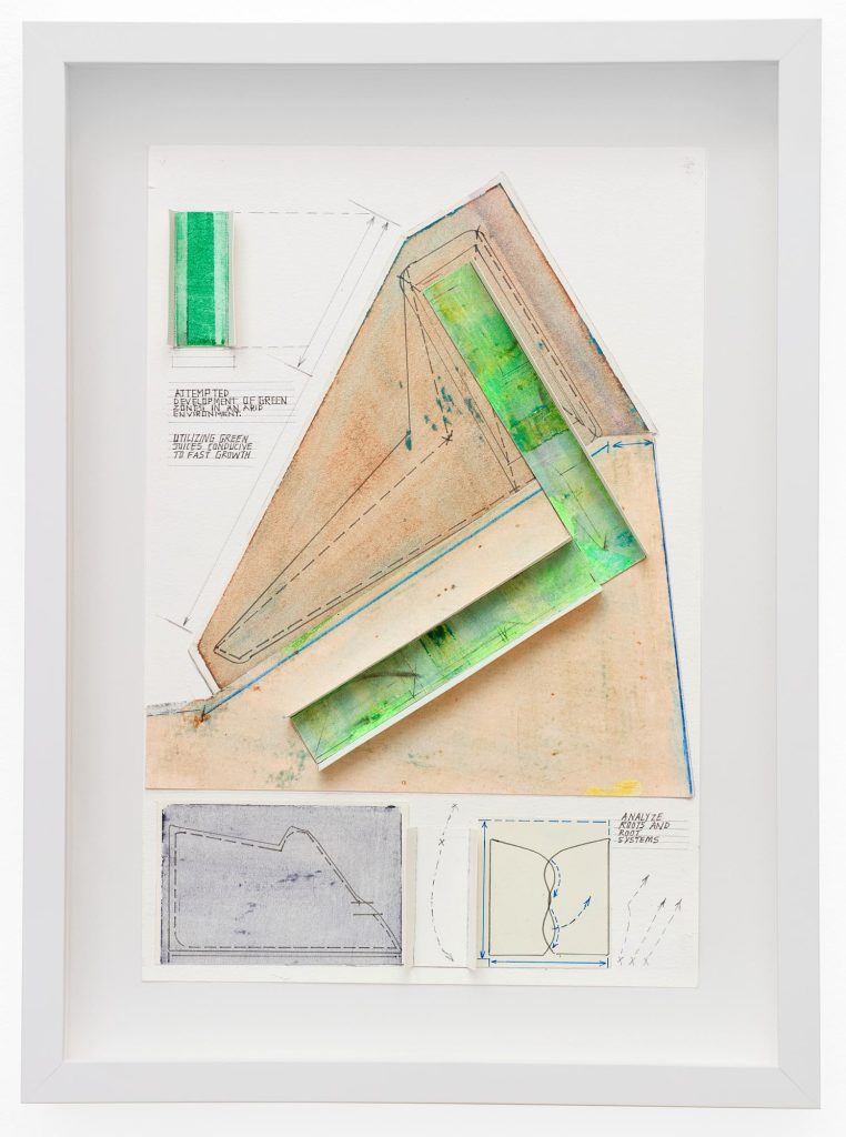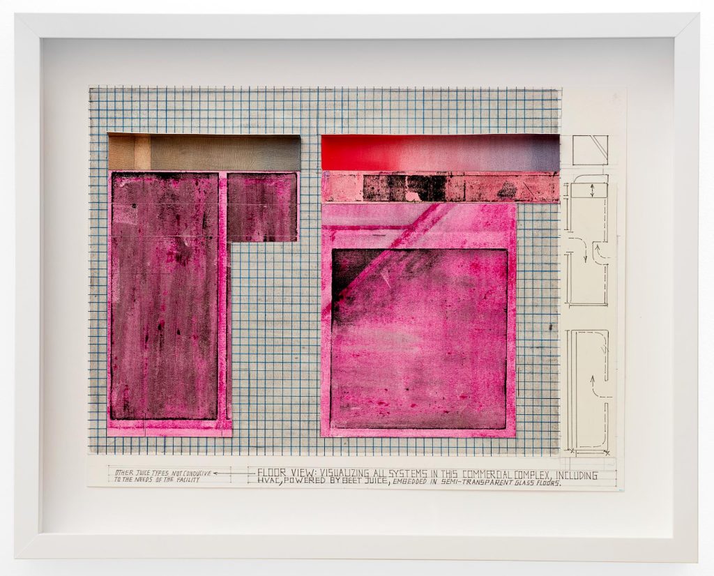 Sokolow’s writing, in the form of hand-drafted texts, gives content and context to the visuals in each drawing which are semi-abstract and often suggest aerial and elevation views of floorplans, the shapes of objects and other diagrammatic elements. Perpendicular dimensional paper tabs protrude from the surface of each drawing’s surface, suggesting walls and other types of boundaries. Some pairings of texts and visuals intentionally don’t quite match up, or they purposefully match up too well in an over-redundant and ridiculous way. Often, something is revealed in the visuals that is not mentioned in the text, and vice versa.