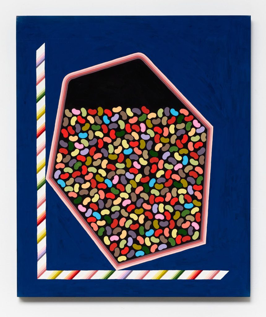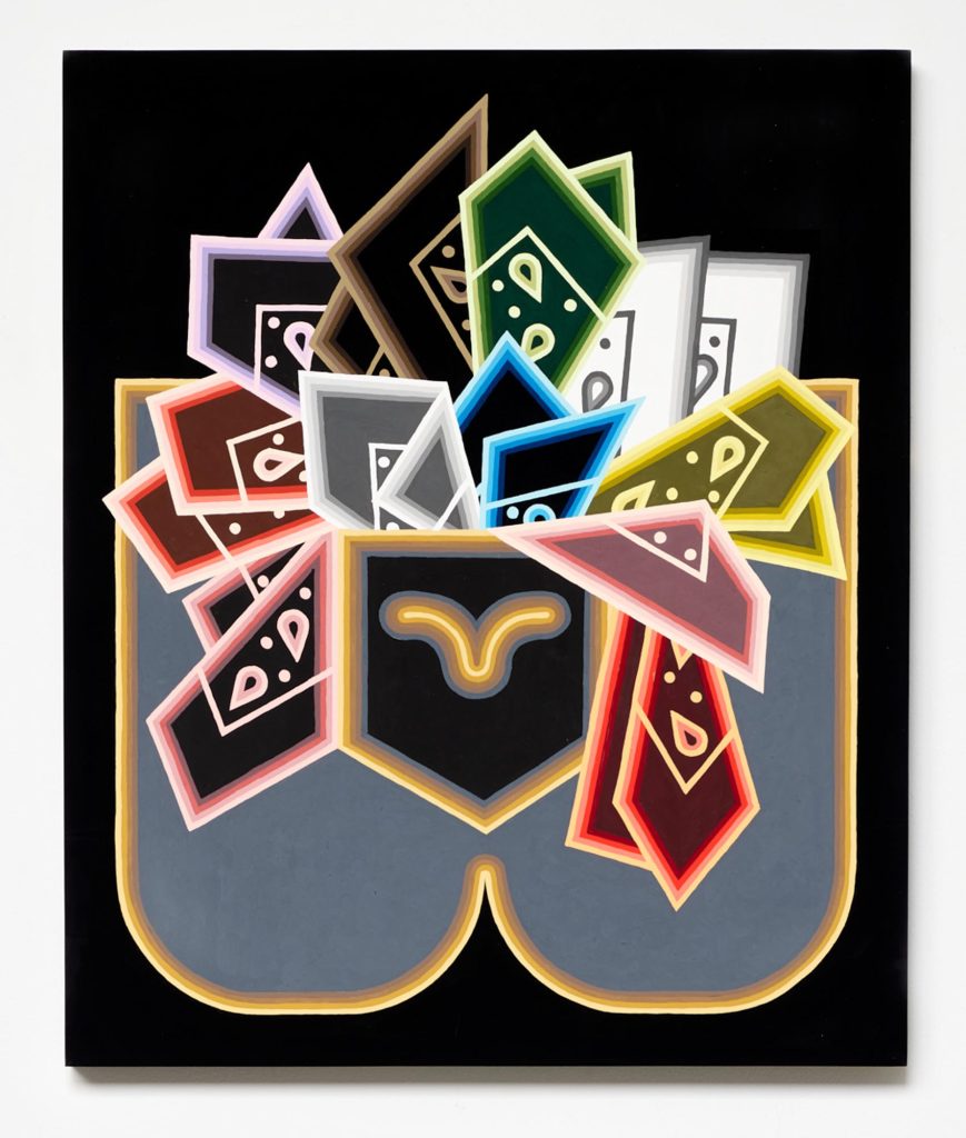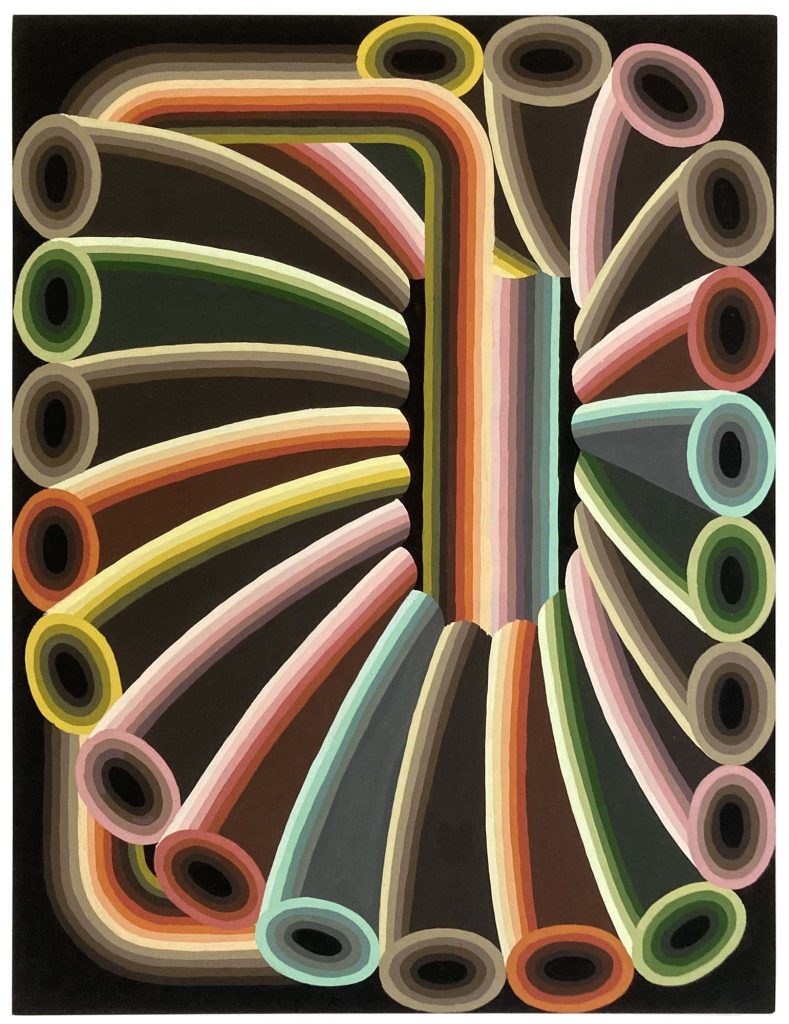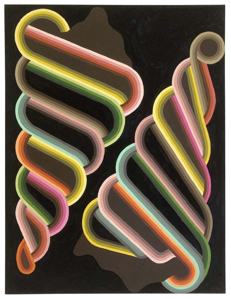 Plotted out beforehand using graphite pencil, rulers and protractors, and hand-painted with the illusion of hard-edged precision, Edie Fake’s artistic practice mines the grammar of architecture to carve out space for bodies that have been othered and invalidated by dominant systems of knowledge. Fake’s abstract representations of community form and collapse, cohere and dissipate, reflective of the real experience within queer lives and their ever-shifting constellations, while centering his central concern for the audacity of queer utopian imagining.