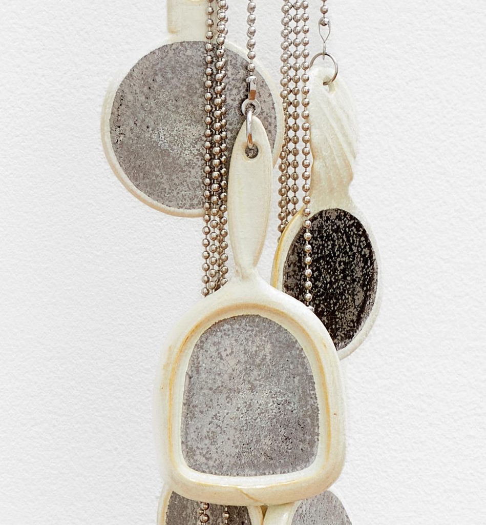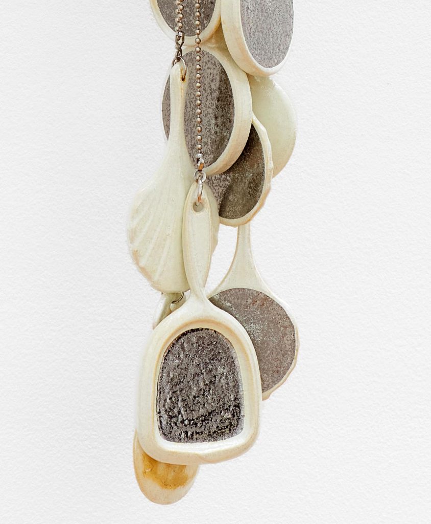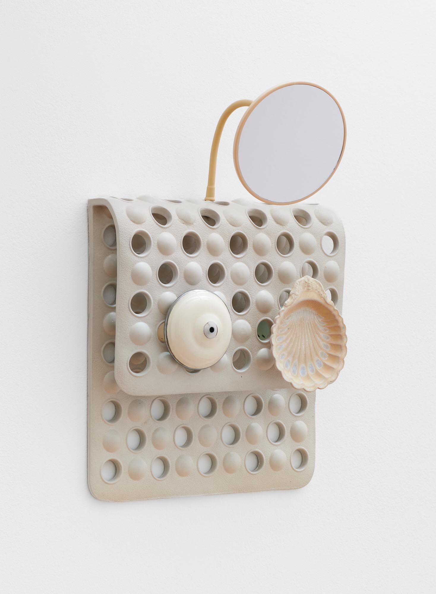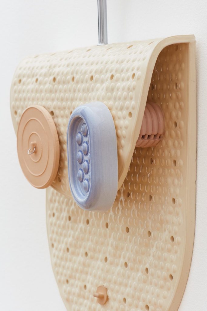 The sculptures often take form as compound objects, made up of both vague and familiar elements from the bathroom and domestic landscape. The merging and interaction of these elements enhance their resonance with the human form. Through gentle gestures in porcelain and stoneware, the sculptures revel in that which is simultaneously strange, beautiful, and perhaps awkward as the body itself can be.