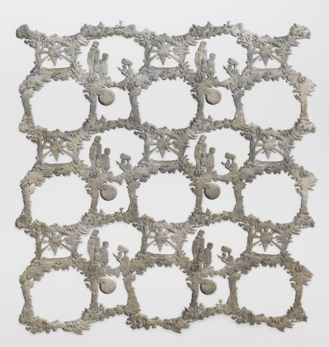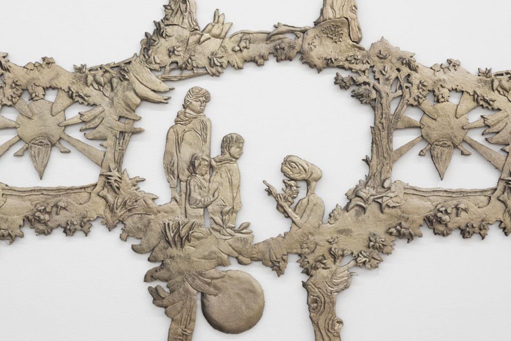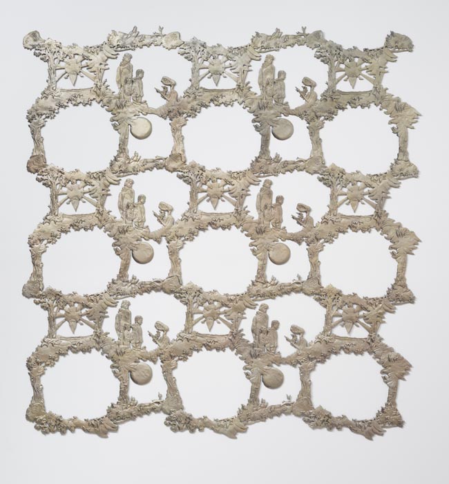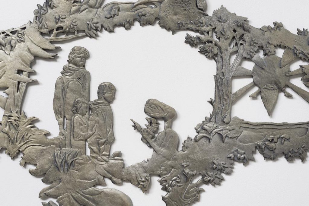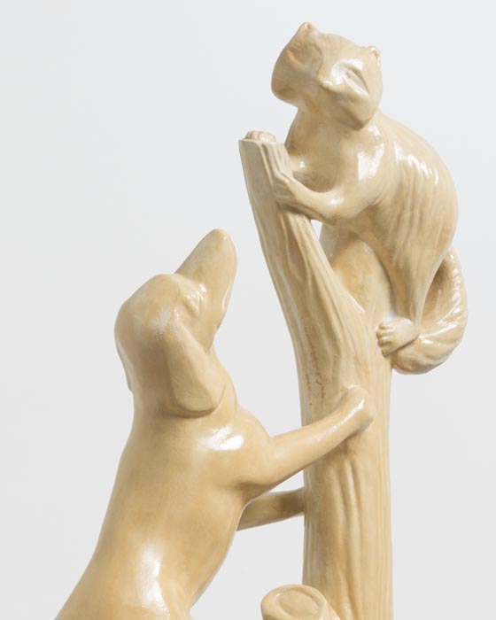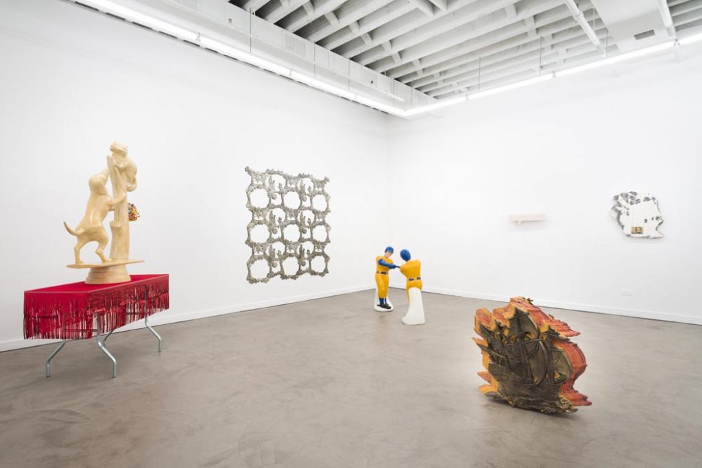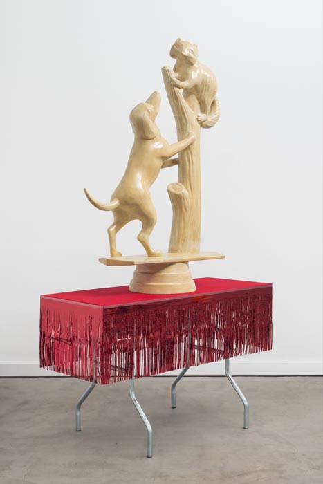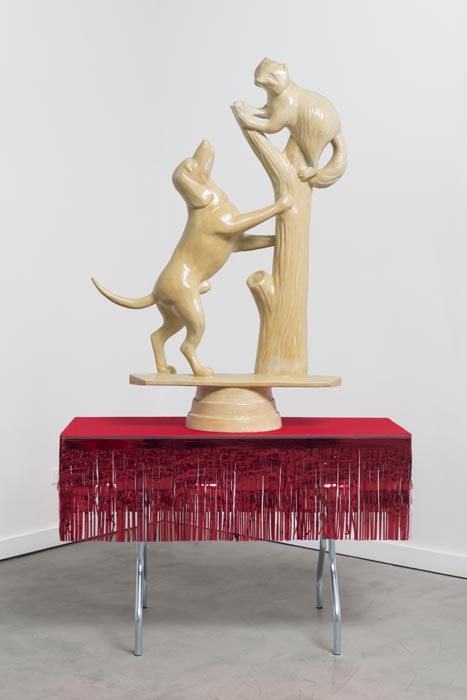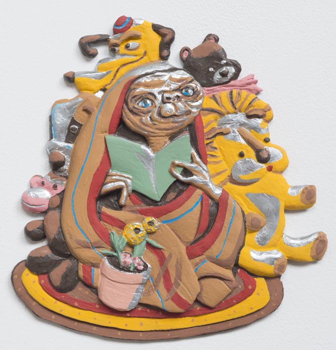 One of the show’s centerpieces is a trophy-like sculpture of a hunting dog that has treed a raccoon, sitting on plain card table decorated in cheap party-store fringe. A set of children’s bedsheets from the 1980’s depicting E.T., the Extra Terrestrial, provide inspiration for a low-relief sculpture sprawling across the gallery walls.