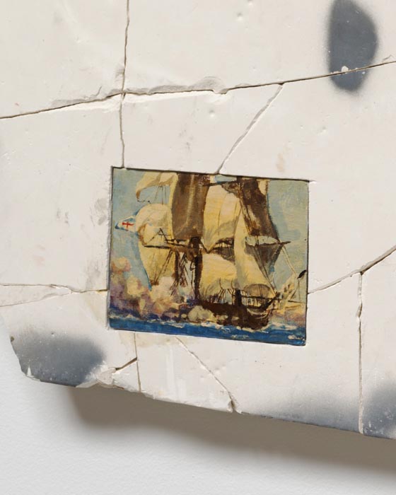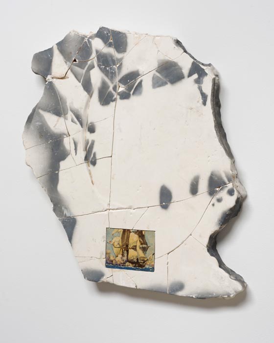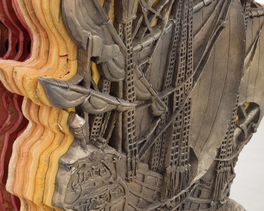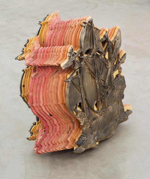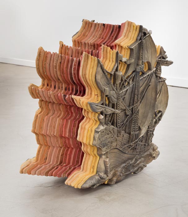 Ben Stone delves into the psychology of low self-esteem. With each mysterious and humorous object, he ponders the condition of unnoticed beauty. One source of inspiration is a crude interpretation of a baseball player used for a dog’s chew toy. But in Stone’s vision, the two comically distorted figures become permanent combatants, locked in a poetic struggle. Another bizarre sculpture takes its inspiration and form from a mass-produced low relief of a Spanish galleon, which he has realized in 3D as a representation of ship at sail across the gallery floor