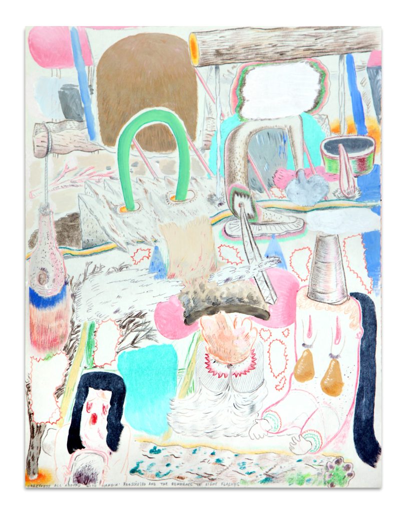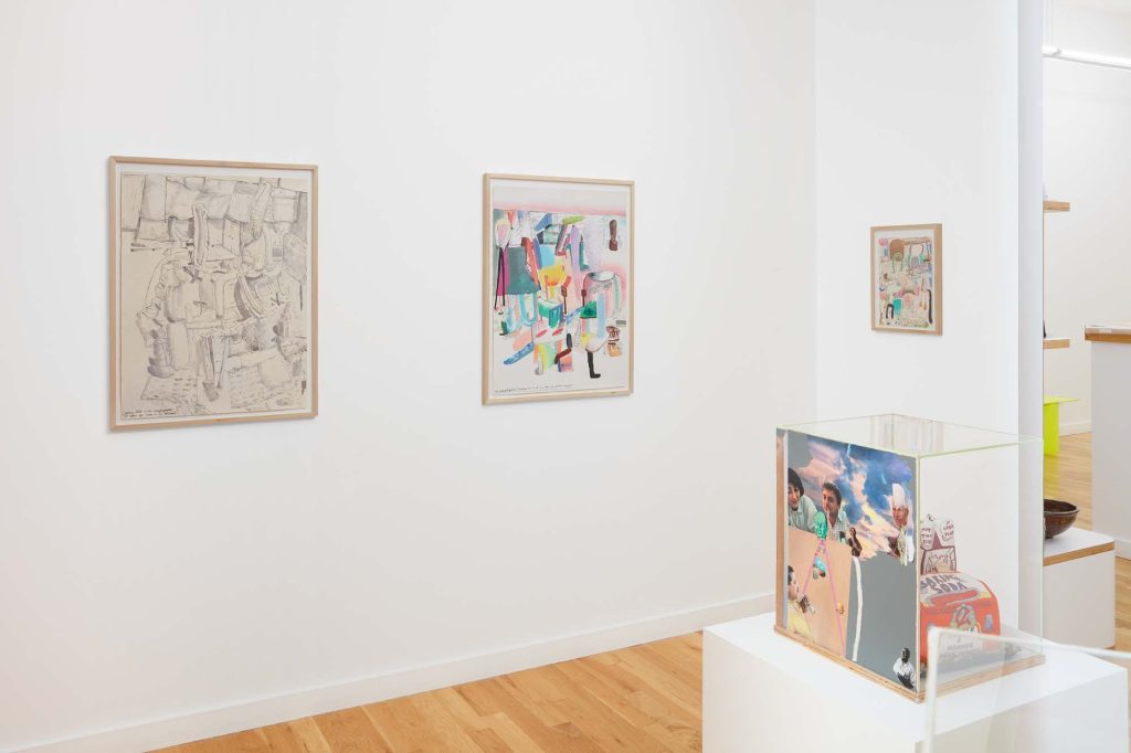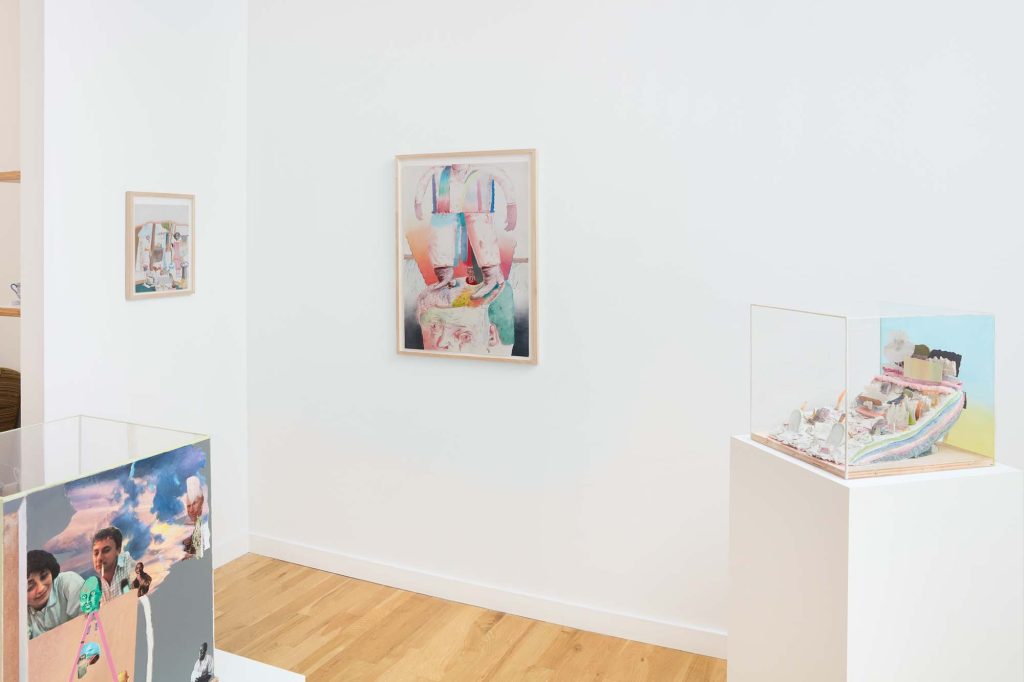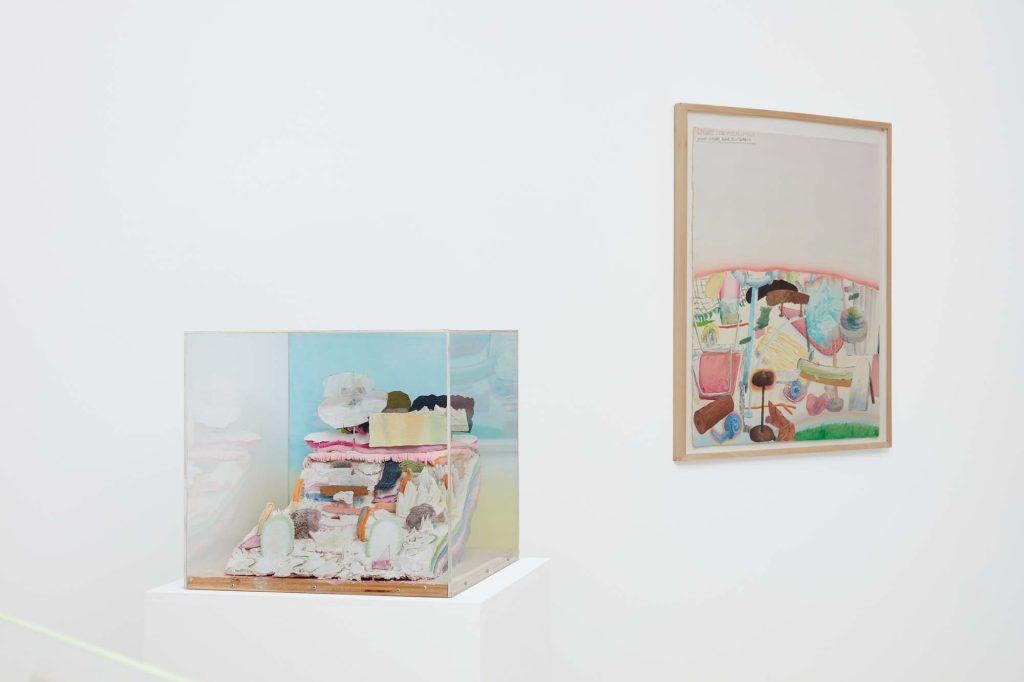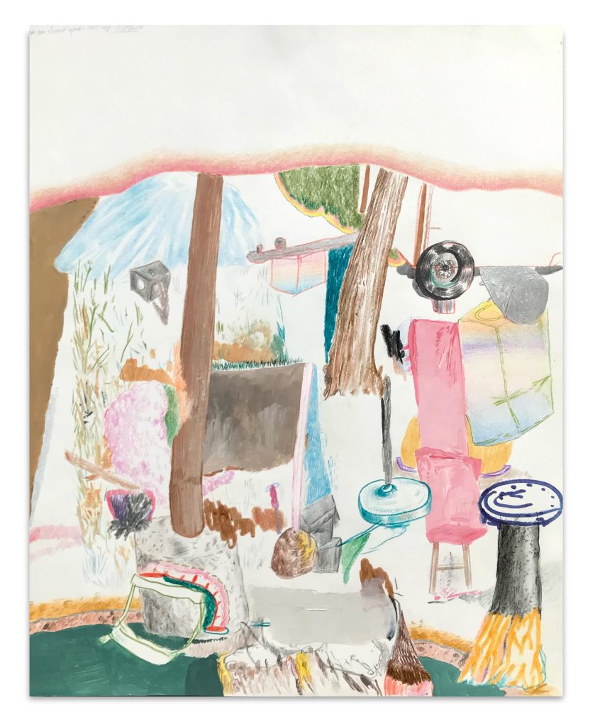 His works on paper echo the multi-perspective quality of comic book pages and surrealist art as overlapping storylines and viewpoints cohabitate in one plane. Nonsensical alignments of objects and narratives intermingle with a humorous, dreamy color palette, often paired with poetically off-kilter titles in his second language, English. Pastries (real and fake), trees, pipes, body parts, treehouses, scenes from the kitchen, shoes and trash from the woods all expand and contract between resolution and dissolution, animating a dreamlike quality where highly vivid thoughts remain incomplete and half-formed.