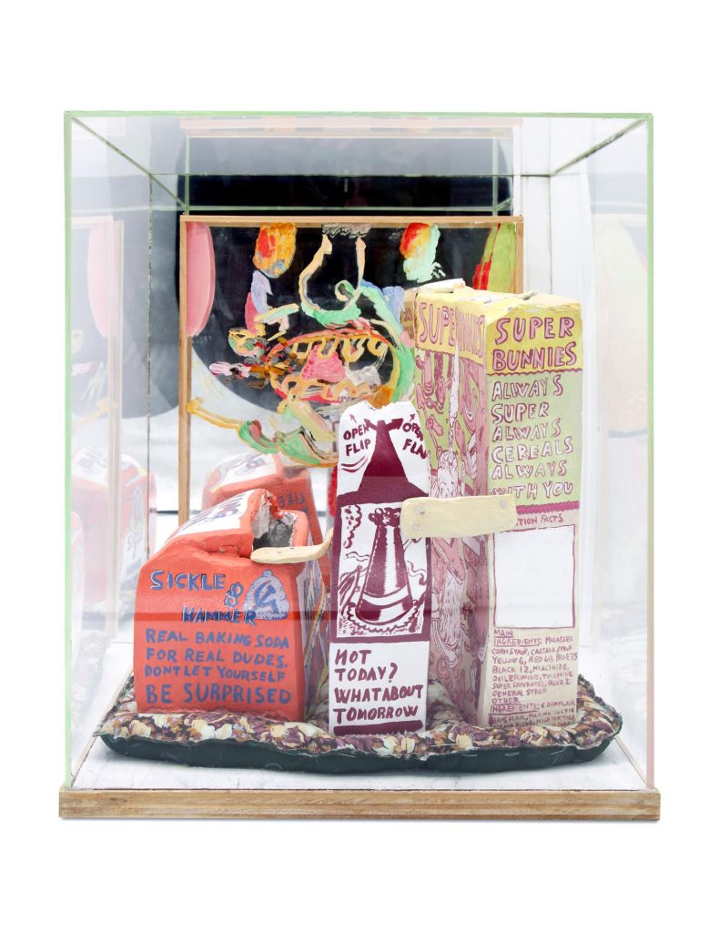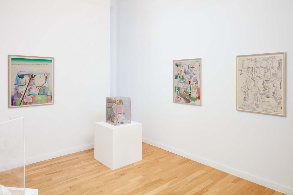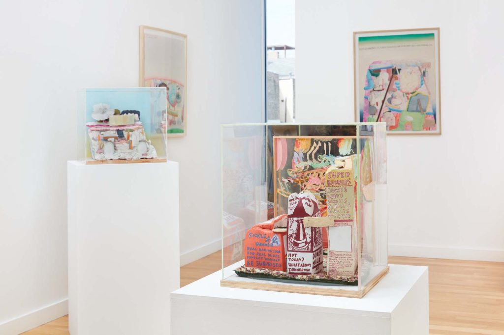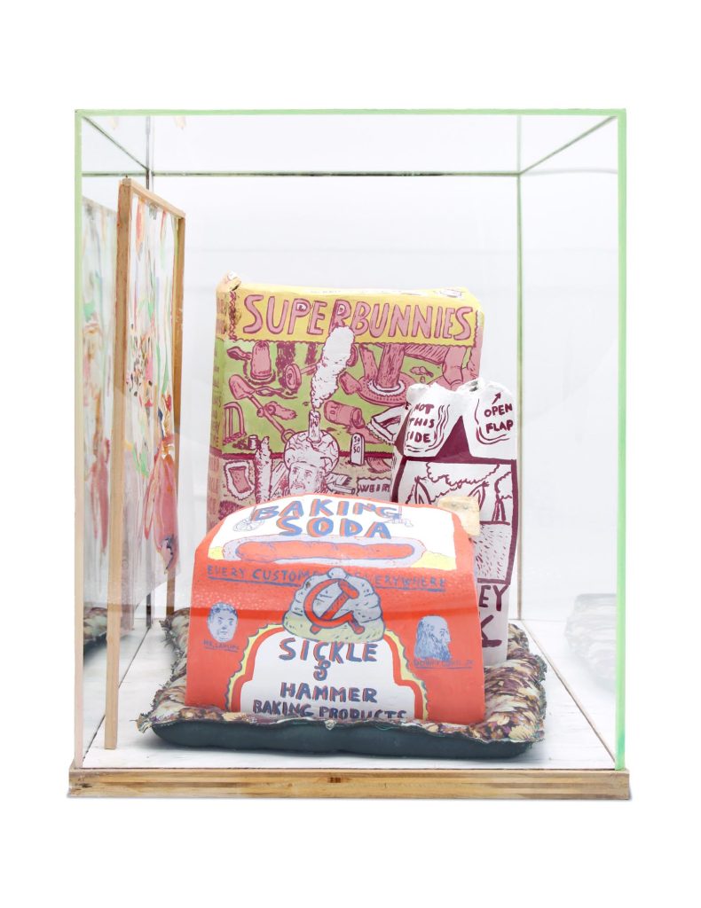 A similar pink slab forms the central image in the work on paper Ronald McDonald And The Axis of Evil On Frakt Boulevard P.M. Instead of being adorned by overalls, this shape serves as the ground for a tumbling tableau of Guston-like forms: boots, human faces, headstones, beer cans, trees hiding fat pixies in their leaf clouds, street signs and hats, punctuated by a head of a pink man at the bottom of the page exclaiming in a comic book balloon “FUCK! IT’S THE AXIS OF EVIL.” We are particularly enamored with another sculpture in vitrine titled “Piece of Skin From My Forehead Enlarged Quite A Bit.” Descriptions defy it, you’ll have to see it in person.