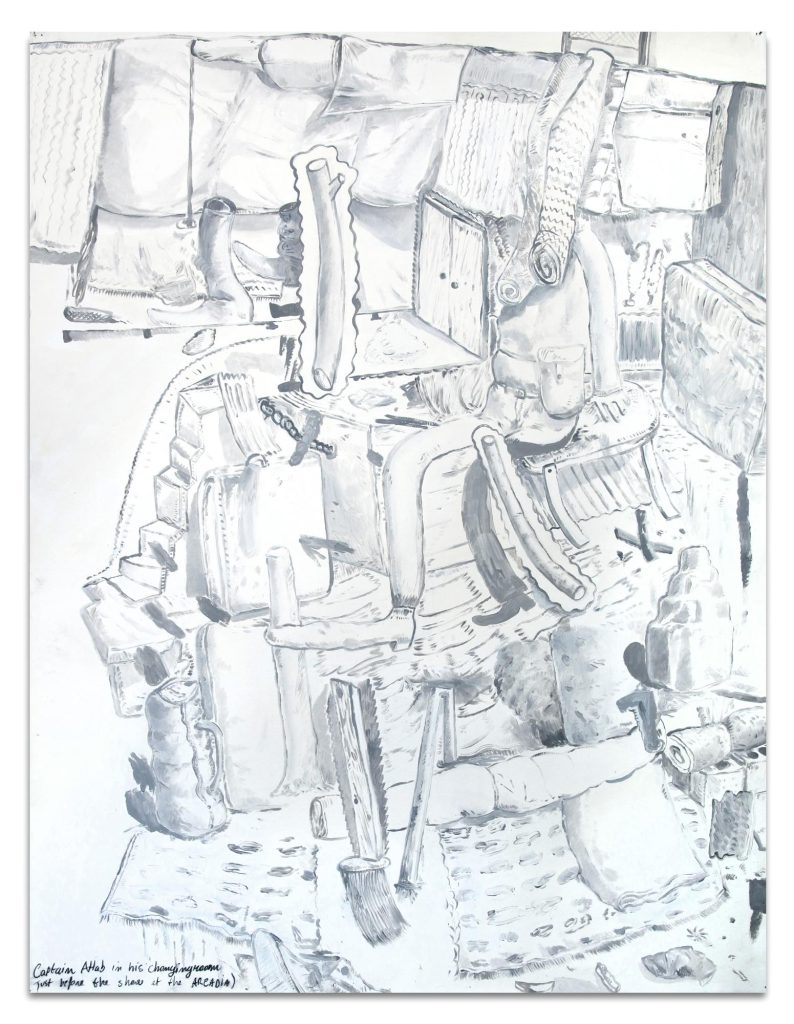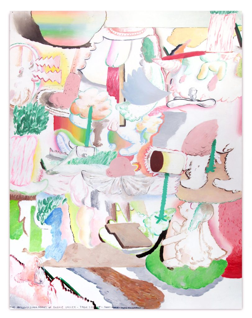Western Exhibitions is thrilled to present our first solo show with Simone Mantellassi, Carpeting In the Kitchen Incorporated. Mantellassi’s paintings on paper and sculptural tableaus poke fun at the tragicomedy life, tackling subjects ranging from two former American presidents, Captain Ahab, Ronald McDonald and the axis of evil, to the ancient superheroes of Ellenic Greece and the Brooklyn Botanical Gardens. Inspired by a trove of artists and filmmakers including David Lynch, Alejandro Jorodowsky, Josephine Halvorson, and Philip Guston, Mantellassi works in an aesthetic fully his own; mixing comic book storytelling, surrealism and formalism into a distinct visual language. The show opens in Gallery 2 at Western Exhibitions in Chicago on September 12 with a public reception from 5 to 8pm. and runs through November 1. Gallery hours are Tuesday to Saturday, 11am to 6pm.