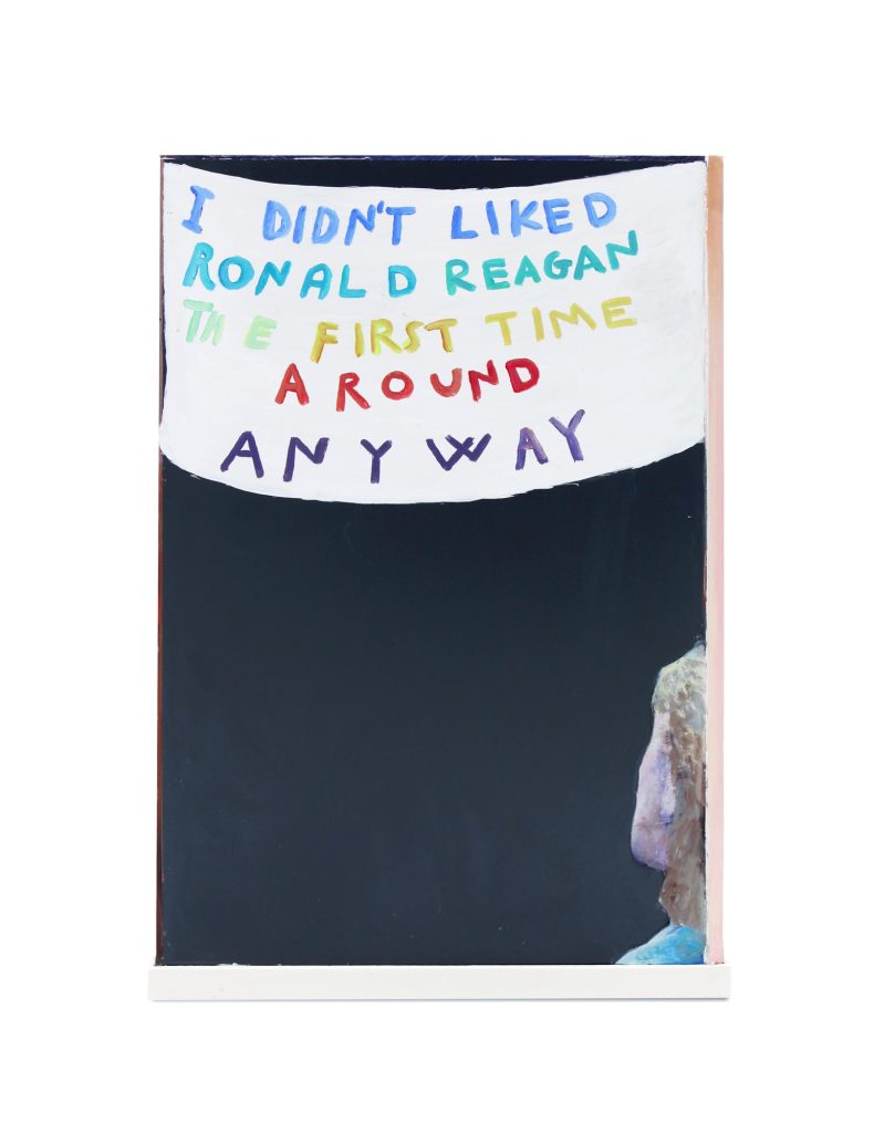 In The Status Of Things As They Have Been an irregularly contoured rectangular slab of pink styrofoam leans back in a clear plastic vitrine, with white overalls painted on it, a torso shape as a stand in for the artist, perhaps. The title of the work is painted cartoonishly on each side of the slab, with quirky sculptures made from commonplace materials inhabit the space. On the back of the vitrine the Mantellassi scrawled on a painted banner “I DIDN’T LIKED RONALD REAGAN THE FIRST TIME AROUND ANYWAY” as a discrete viewer gazes up at it from the bottom right of the plane.