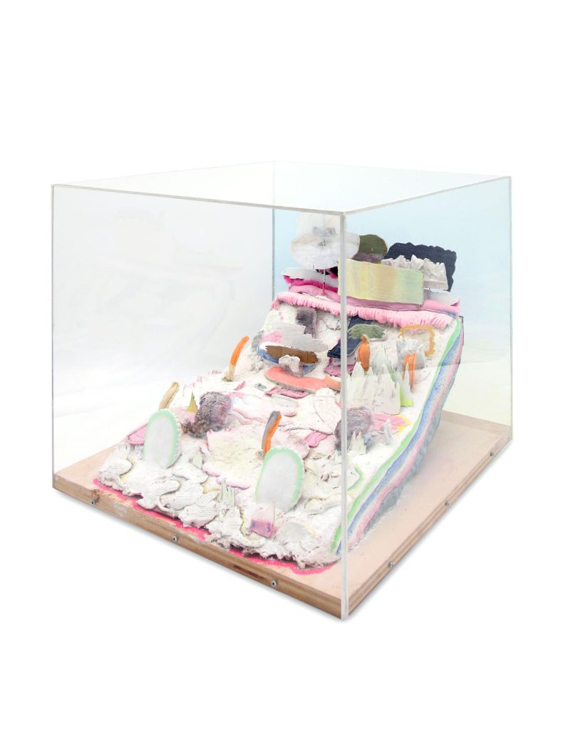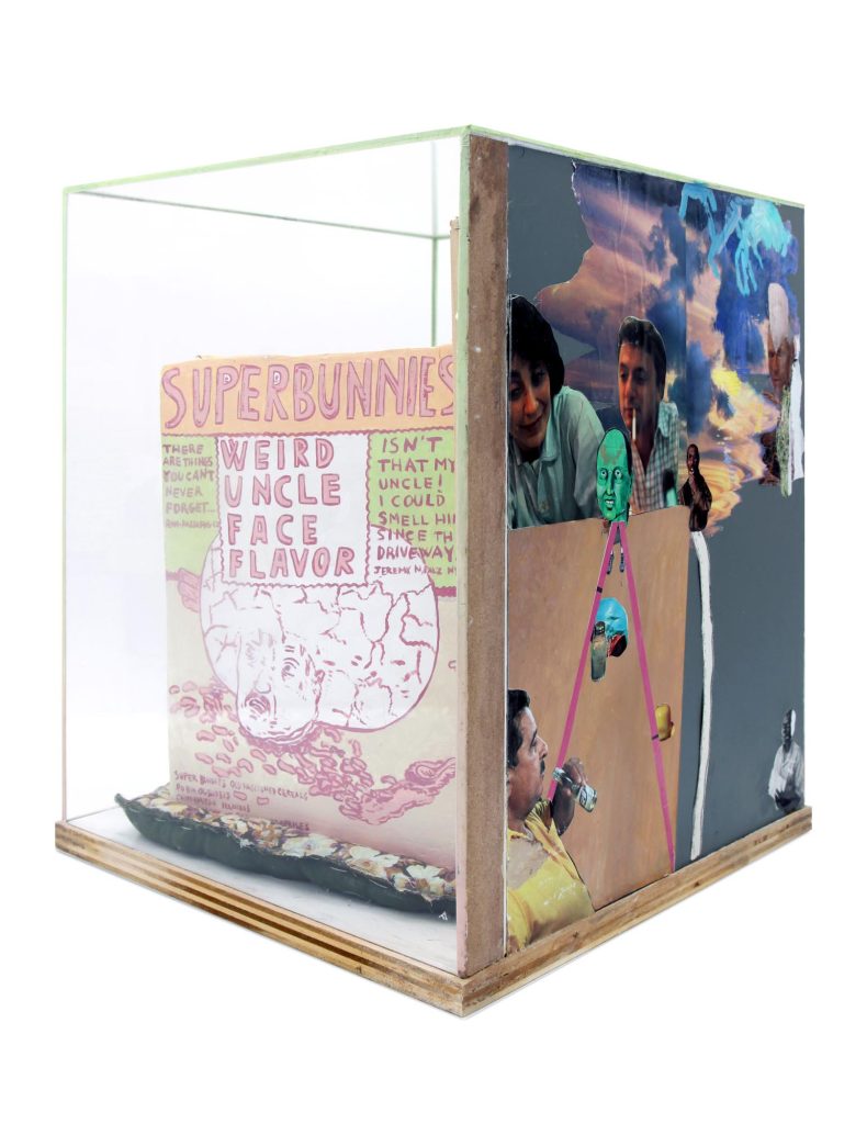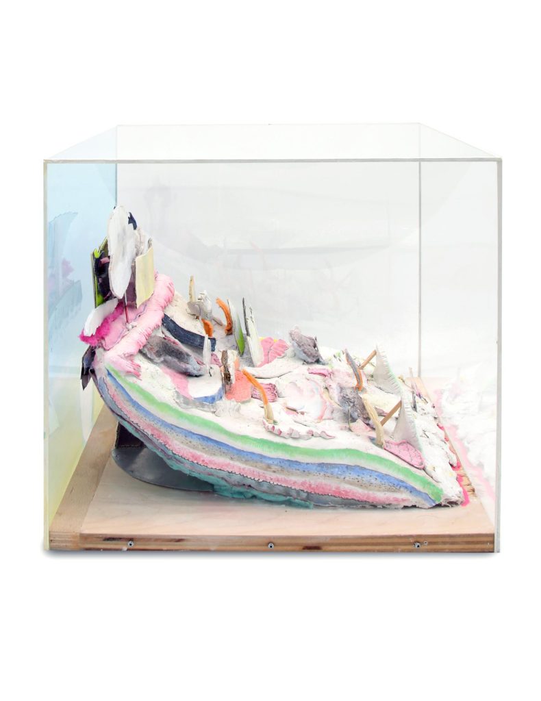 From certain drawings, Mantellassi creates three-dimensional sculptures—compact, diorama-like compositions composed of everyday materials in plexiglas casing. The humor and irony of his work is made concretely manifest in these objects, whose crumply, crude surfaces and “imperfect” finishes are precisely where the work culminates most fully; stage-sets for the tragicomedy of life where narrative and its artifice are on display simultaneously.