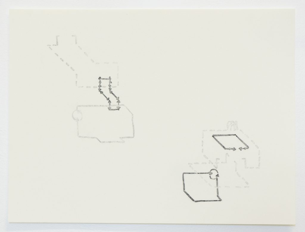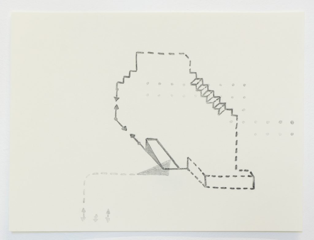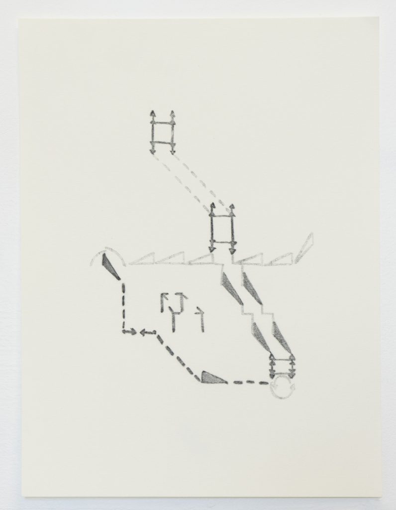 Shir Ende (lives and works in Chicago) is interested in what it would look like if our bodies could become material to build architecture. Ende wants to reposition the choreographer as an architect, enabling them to shape environments by directing movements that define space. Her drawings use a notational system to devise proposals of impossible scores for performances and nonsensical floor plans simultaneously. They imagine a world not limited by gravity and time. Merging flatness and dimensionality, destabilizing the horizon line, alternating perspectives further disorientates the viewer. Ende’s drawings do what a performance cannot: create a record of an articulated space.