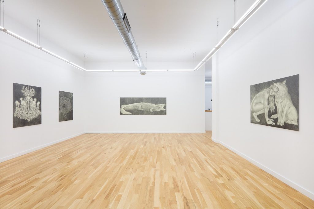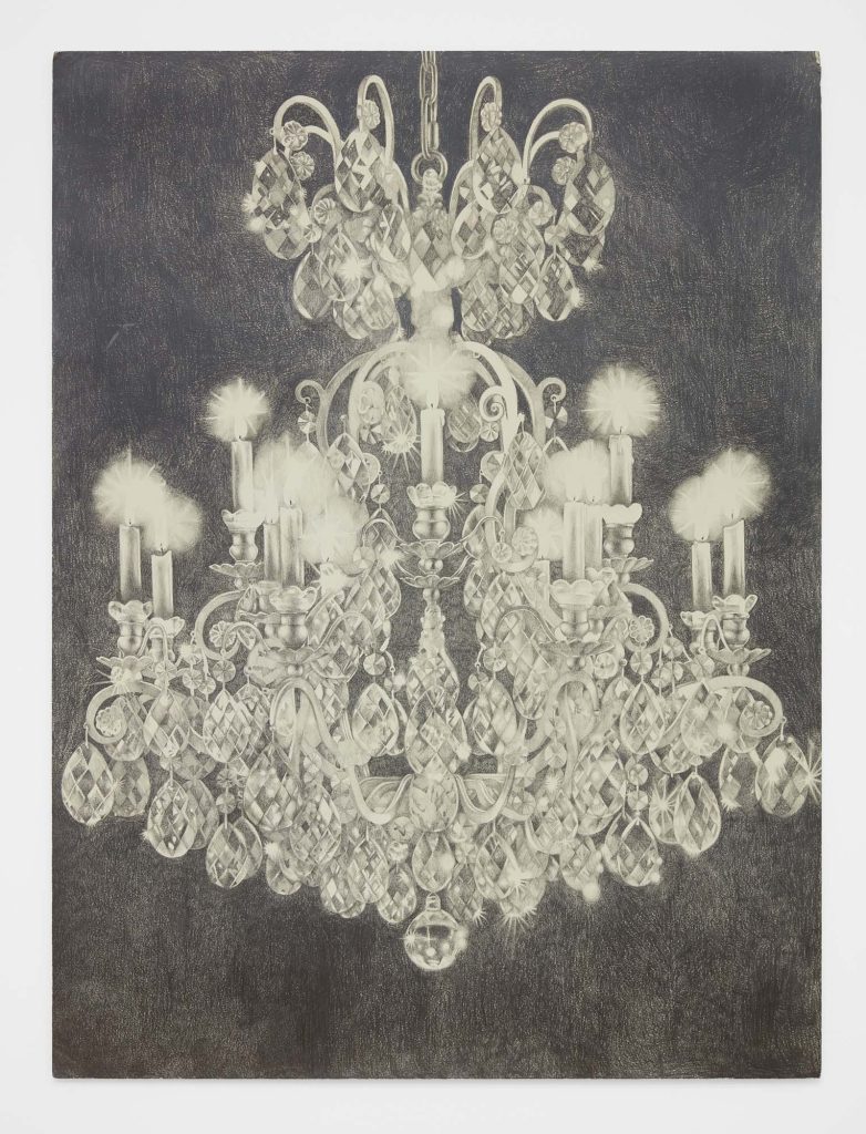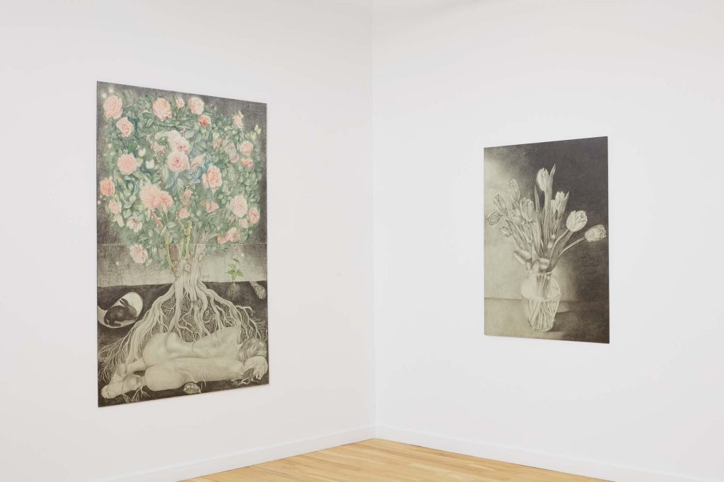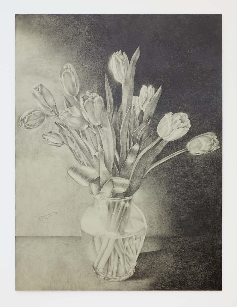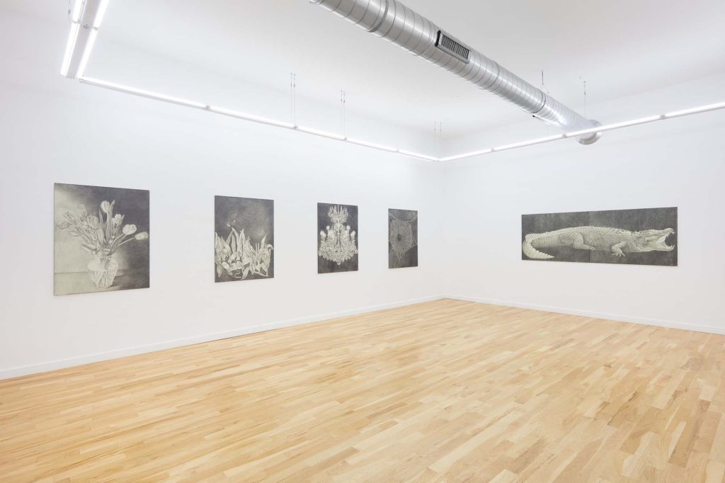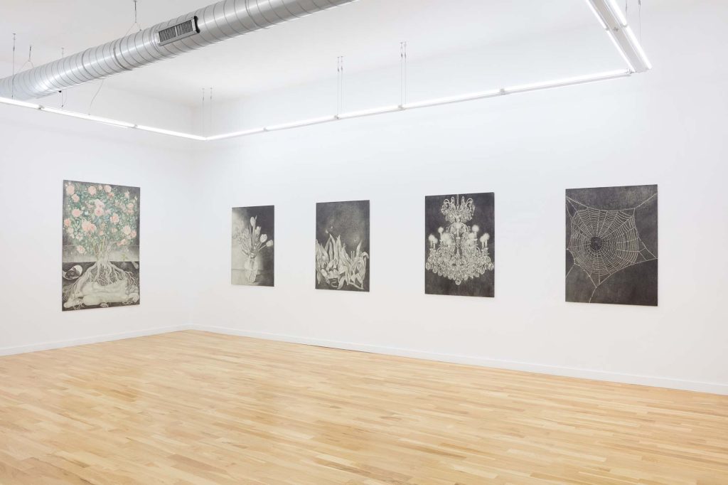 Another word for twilight is gloaming, which influences Cirdain’s almost exclusive use of a crepuscular value range of graphite. She meticulously renders moments of tension between the human and non-human, reimagining art historical subjects (still lives, nudes, and luxury items) as living participants in an enmeshed environment. With a film director’s focus on drama and a romantic flirtation with the macabre, her drawings betray an exquisite attention to light surface as a chandelier becomes an environment for cobwebs; a spiderweb glistens like crystal; a bouquet hangs next to the site of its extraction; an environment shows beheaded tulips. Her drawings engage with ideas about living and dying as entangled beings.