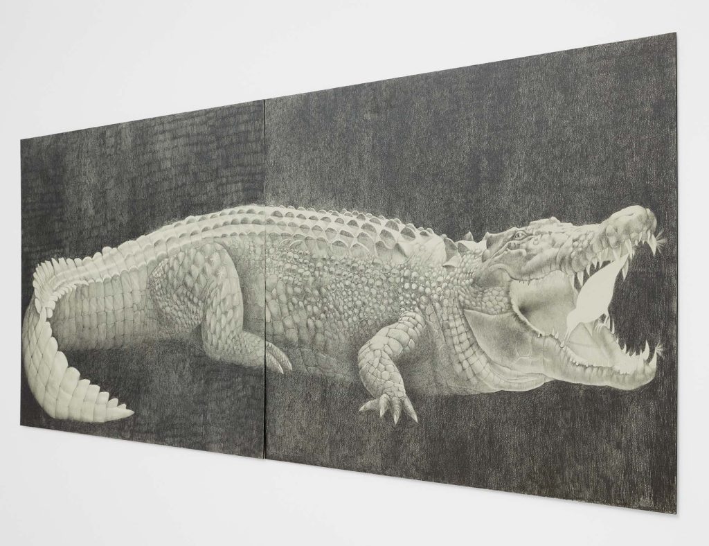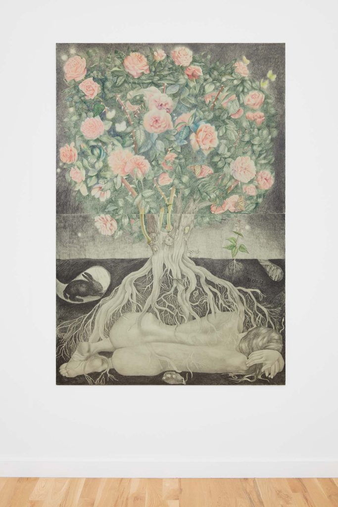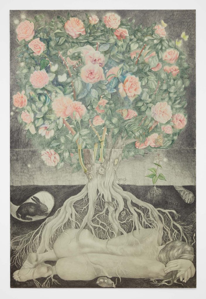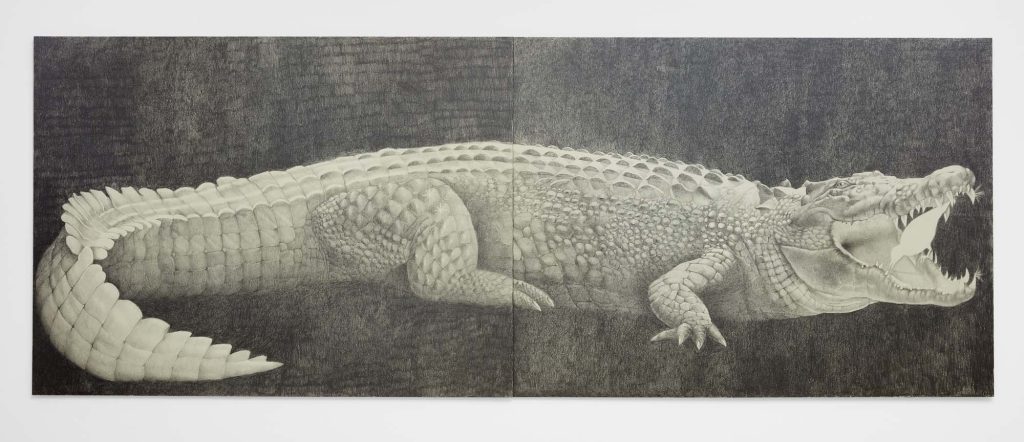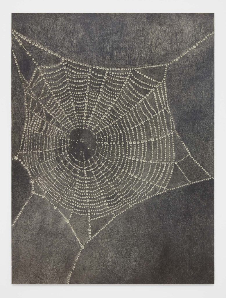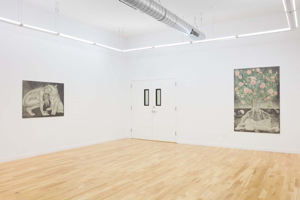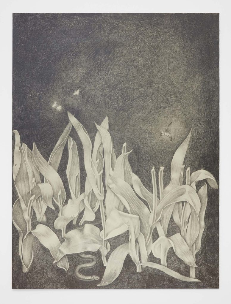 Another word for twilight is gloaming, which influences Cirdain’s almost exclusive use of a crepuscular value range of graphite. She meticulously renders moments of tension between the human and non-human, reimagining art historical subjects (still lives, nudes, and luxury items) as living participants in an enmeshed environment. With a film director’s focus on drama and a romantic flirtation with the macabre, her drawings betray an exquisite attention to light surface as a chandelier becomes an environment for cobwebs; a spiderweb glistens like crystal; a bouquet hangs next to the site of its extraction; an environment shows beheaded tulips. Her drawings engage with ideas about living and dying as entangled beings.